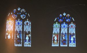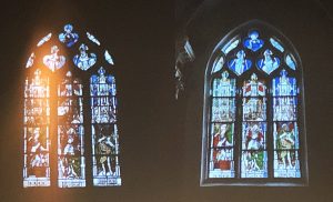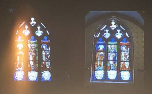 Les vitraux datent du 15e siècle, ce sont des témoins rares et précieux de l’époque (personnages, vêtements, paysages, outils, …). Voici l’avant-après de la restauration : couleur/transparence. Ils ont été remontés au 19e siècle mais il existait des contrastes entre les différents verres. Ils ont été remplacés pour conserver une unité, et avoir une lecture homogène et cohérente. (La grisaille a été reprise: les maîtres verriers utilisaient cette technique de peinture sur les vitraux pour créer des détails et des nuances).