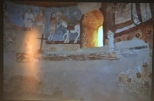 Eglise de Taponas (fermée car état préoccupant): autre exemple de peintures murales. Elle a été largement reconstruite au 19e siècle (1858) : le chœur et le clocher anciens ont été aménagés en crypte et donc conservés. Des infiltrations ont lieu par les toitures et impliquent la présence d’algues en raison de l’humidité. Elles sont à traiter, retirer et stabiliser… depuis 1955 aucune intervention.
