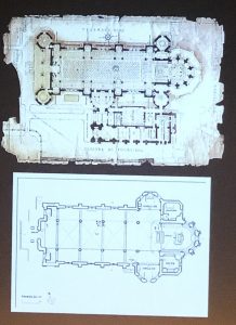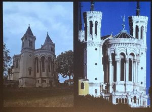 Les travées sont plus larges ou plus étroites, (ci-contre: plan de l’église de Fourvière en haut, de Régnié en bas)