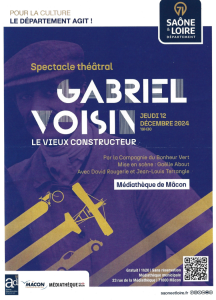 Le spectacle théâtral « Gabriel Voisin le vieux constructeur » par la Compagnie du Bonheur Vert, mis en scène par Gaëlle About, a eu lieu jeudi 12 décembre 2024 à la médiathèque de Mâcon. Gaëlle About est la fille d’un photographe et journaliste de presse à Tournus, Philippe About, interprété par David Tougerie) qui a rencontré plusieurs fois Gabriel Voisin (joué par Jean-Louis Terrangle) et s’est lié d’amitié avec lui. La mise en scène donne vie aux échanges complices entre « le vieux constructeur » et le jeune reporter, de nombreuses informations sont également tirées des livres de Gabriel Voisin.