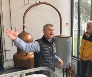 Dans la distillerie, Philippe Vançon nous explique le fonctionnement avec la colonne de distillation, les vases en cuivre, qu’il faut remplir, puis sous l’effet de la chaleur, la vapeur va traverser les vases… qu’il faudra vider et reremplir. L’alcool va monter avec la vapeur. Puis on refroidit avec le réfrigérant ou refroidisseur. C’est une distillation très lente : il faut environ 1h par vase pour un fût de 200 litres qui donnera 63/65 degrés d’alcool, il faut 3 tonnes de Marc !